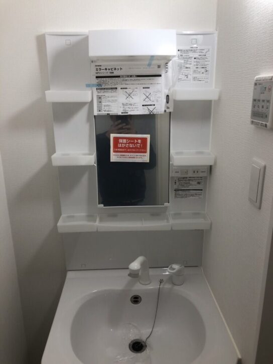 既存の鏡や、収納部分を取り外します。電気配線がある場合があり、注意が必要です。