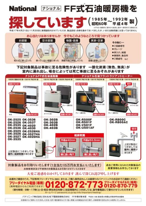 1985年(昭和60年)~1992年(平成4年)製のNational FF石油暖房機を探しています。
